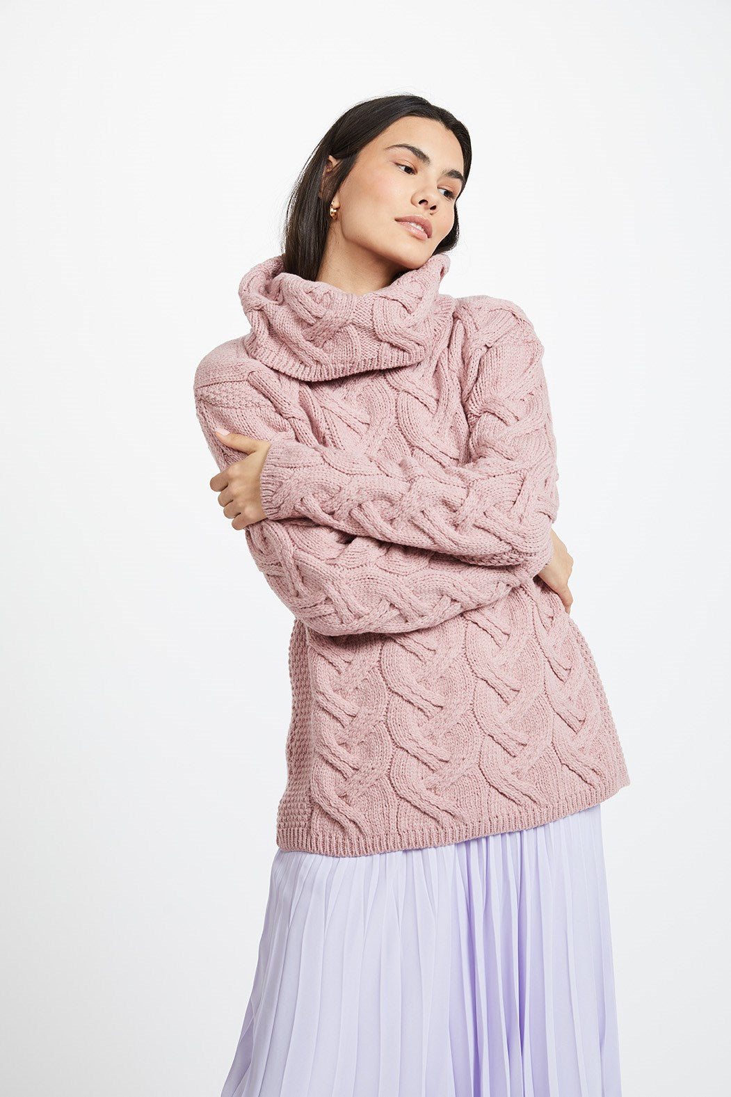 Zeer soepele, zachte damestrui met ruime col. Een stijlvolle trui met royale kabels, in diverse mooie kleuren. Een vleugje luxe!