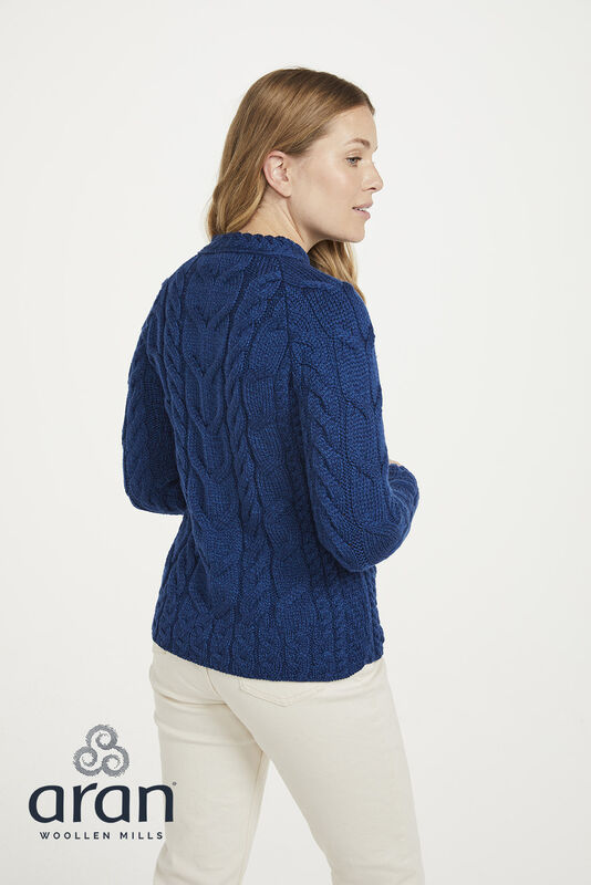 Elegante Aran Woollen Mills damestrui van zachte merinowol. Deze soepele damestrui is gebreid in mooie royale kabels en heeft een klein boordje rond de hals. Een vleugje luxe!