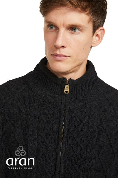 Herenvest met rits van Aran Woollen Mills, gebreid van van zuiver scheerwol van shetland schapen. Het vest heeft diverse breipatronen in het voorpand, waaronder diamant en kabelpatronen. Het vest heeft een opstaande boord die gevoerd is met zachte fleece. Het vest zelf is gevoerd met zachte katoen. Een geweldig kledingstuk dat je netjes kunt dragen over een overhemd, of casual met een t-shirt en een spijkerbroek. De zuivere scheerwol zorgt voor een zeer behaaglijke warmte.