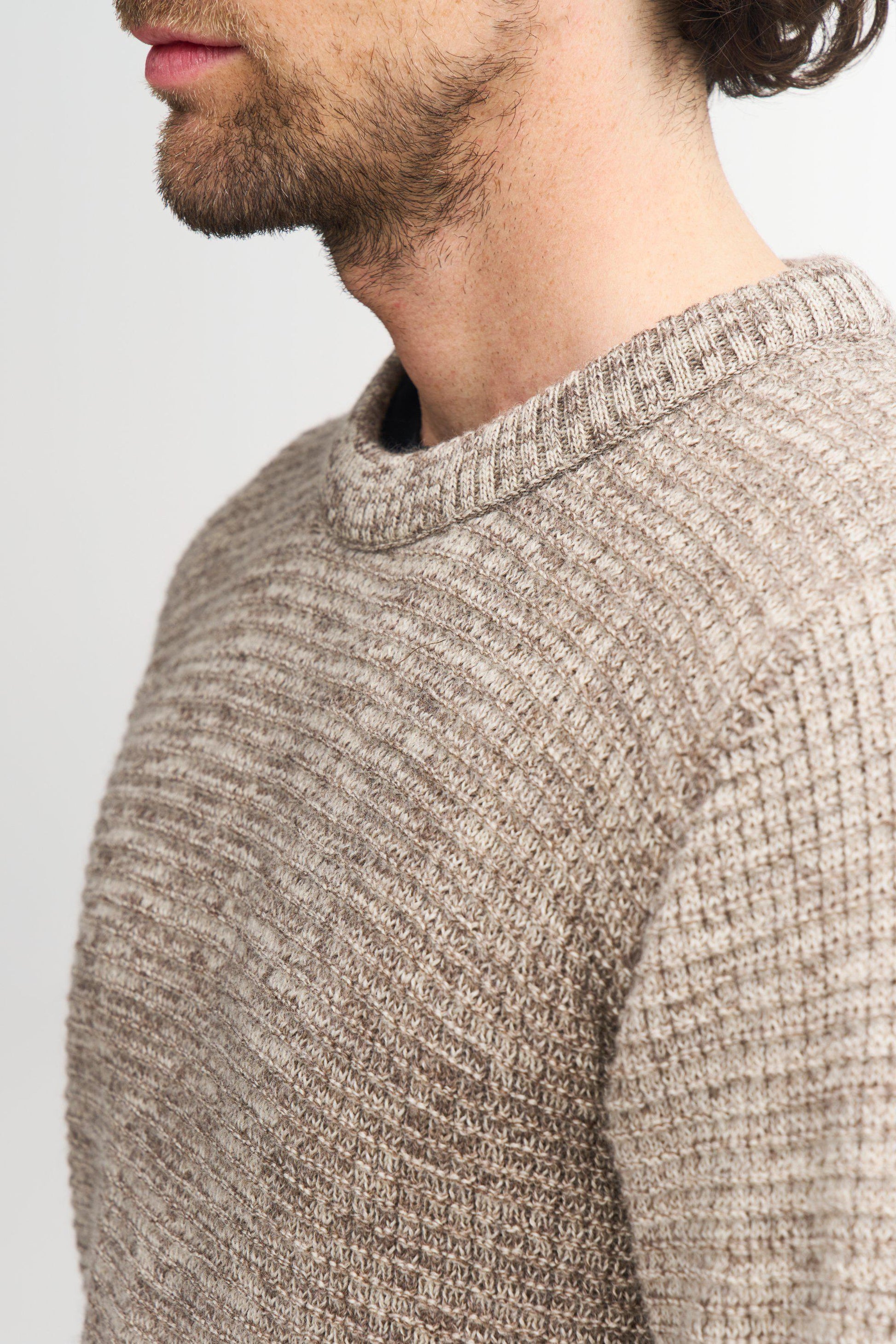Een mooie klassieke trui met ronde hals (crewneck). De trui is structuurgebreid en heeft ribgebreide boorden en manchetten en is voorzien van een Ivanhoe embleem op de linker mouw. Deze trui komt uit de NLS serie, gebreid in 100% zuivere ongeverfde wol.  Een tijdloze klassieker waar je jaren plezier van zult hebben!