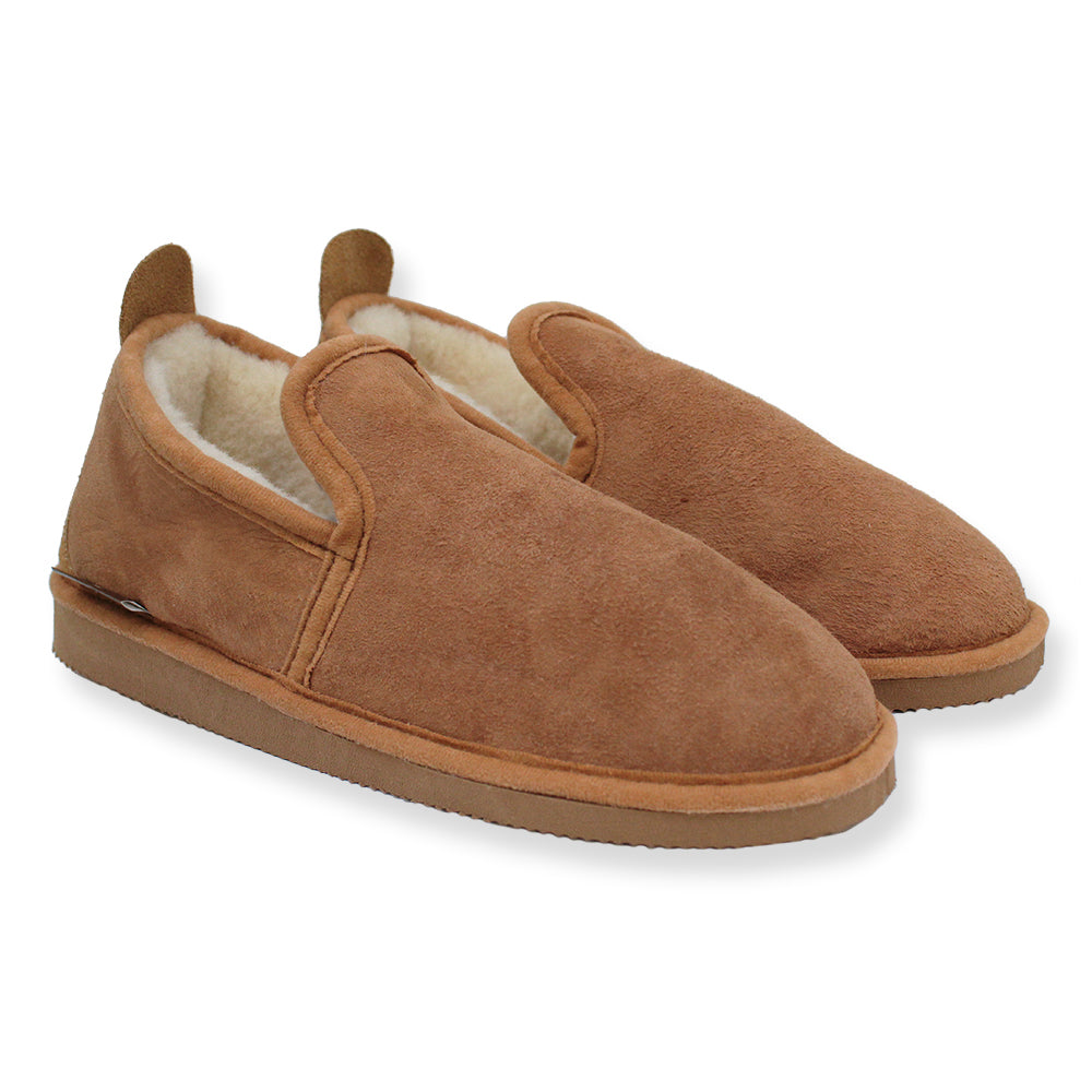 Pantoffel van schapenvacht met ruime instap.