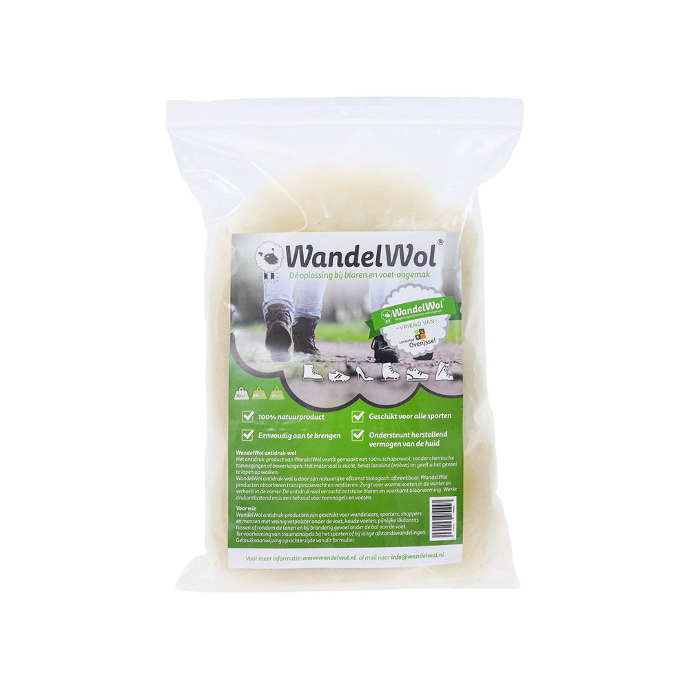 WandelWol® antidruk-wol bestaat uit een hybride melange van 100 % super zachte en mild gereinigde schapenwol, zonder chemische toevoegingen of bewerkingen. De wol is zacht en bevat lanoline (wolvet). De wol kan gedragen worden in je schoenen en helpt pijnlijke voeten en blaren voorkomen.