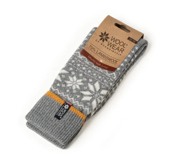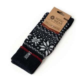 Heerlijk warme wollen sokken met ingebreid patroon. Eén sok is voorzien van een label met de Noorse vlag aan de bovenzijde. Let op, de sokken van Woolwear vallen groot.