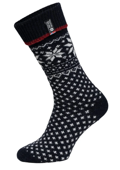 Heerlijk warme wollen sokken met ingebreid patroon. Eén sok is voorzien van een label met de Noorse vlag aan de bovenzijde.