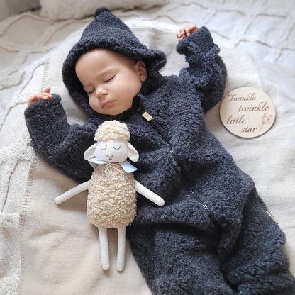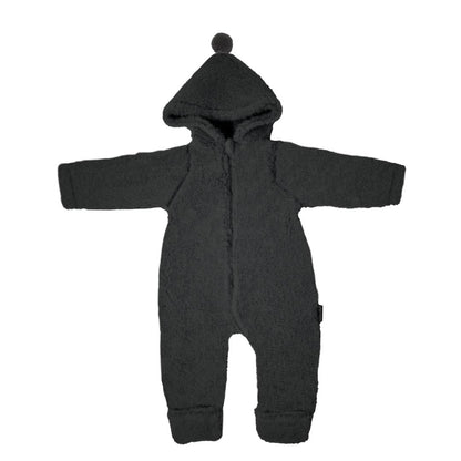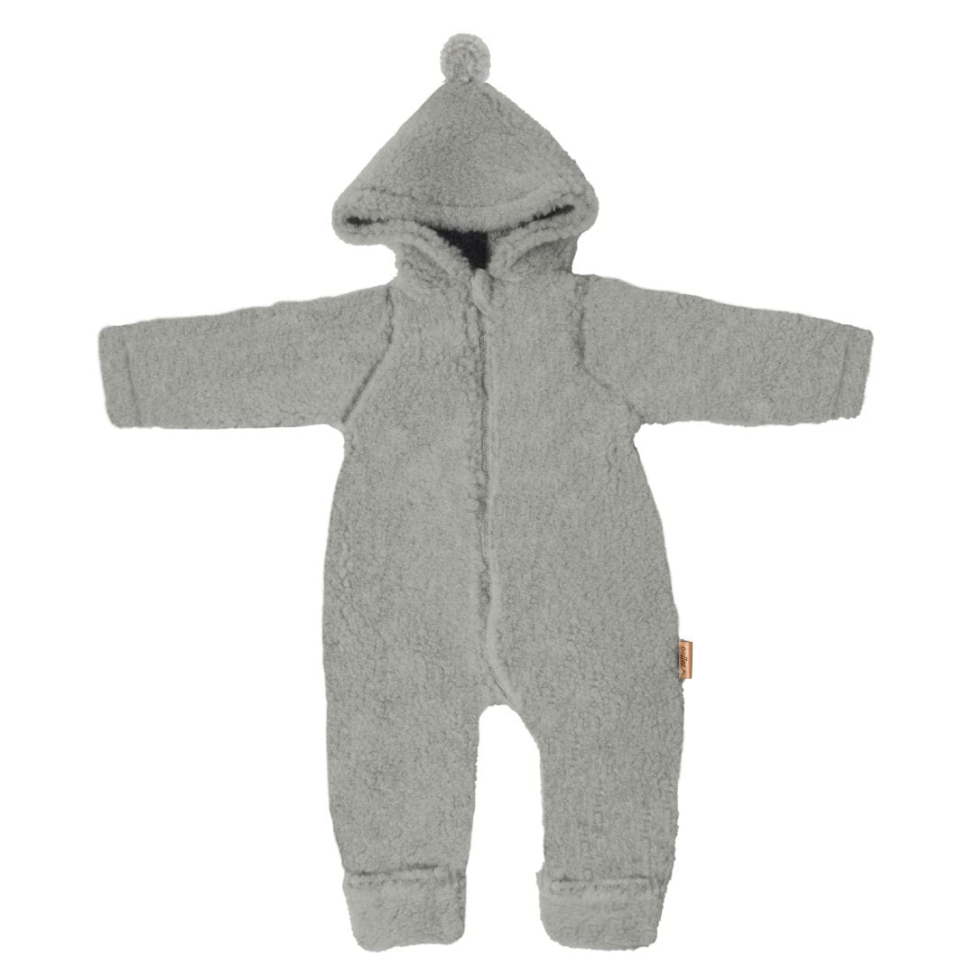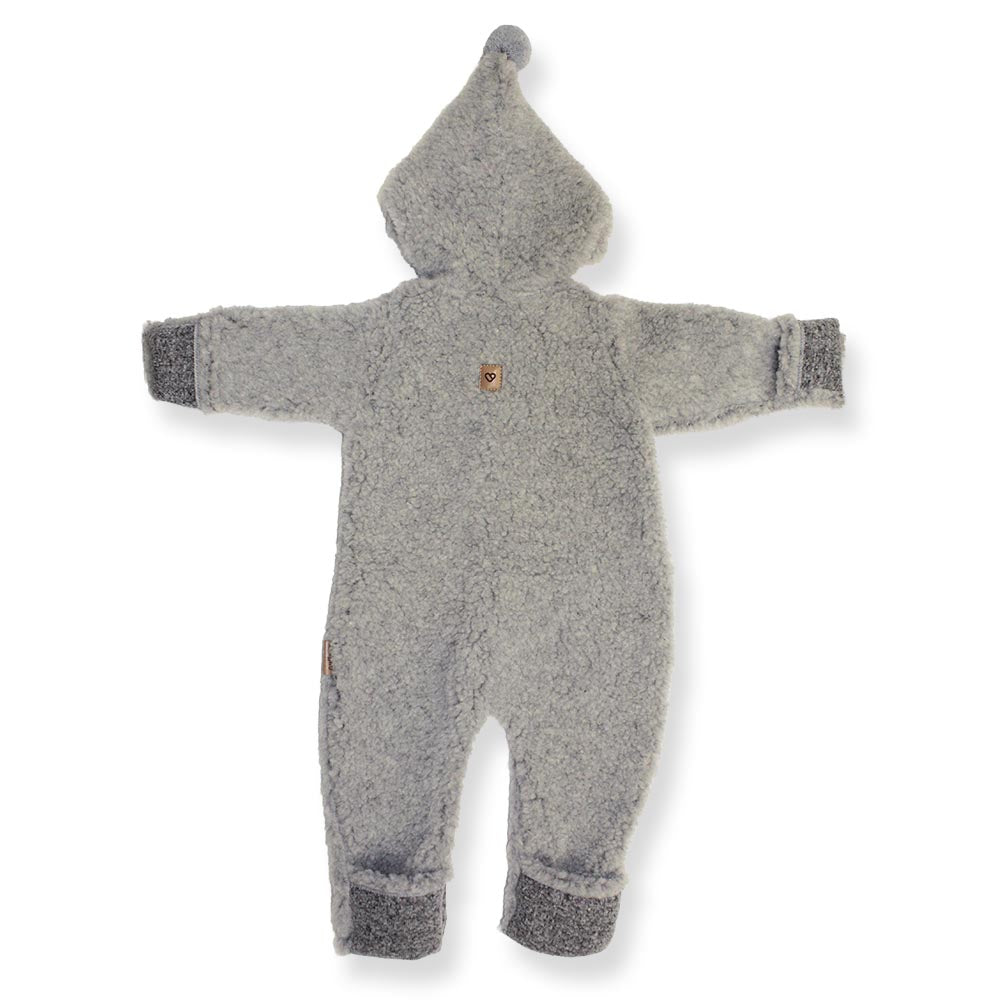 Stijlvolle wollen jumpsuit voor baby's, met capuchon. Het zachte boxpakje heeft lange mouwen en is voorzien van een handige rits, zodat je het makkelijk aan en uit kunt doen bij je baby. De rits loopt van de hals tot de onderkant van het boxpakje. Aan de onderzijde van de mouwen en de pijpen zit een gebreide omslag die je om de handjes/voetjes van je baby kan doen, zodat deze lekker warm blijven.